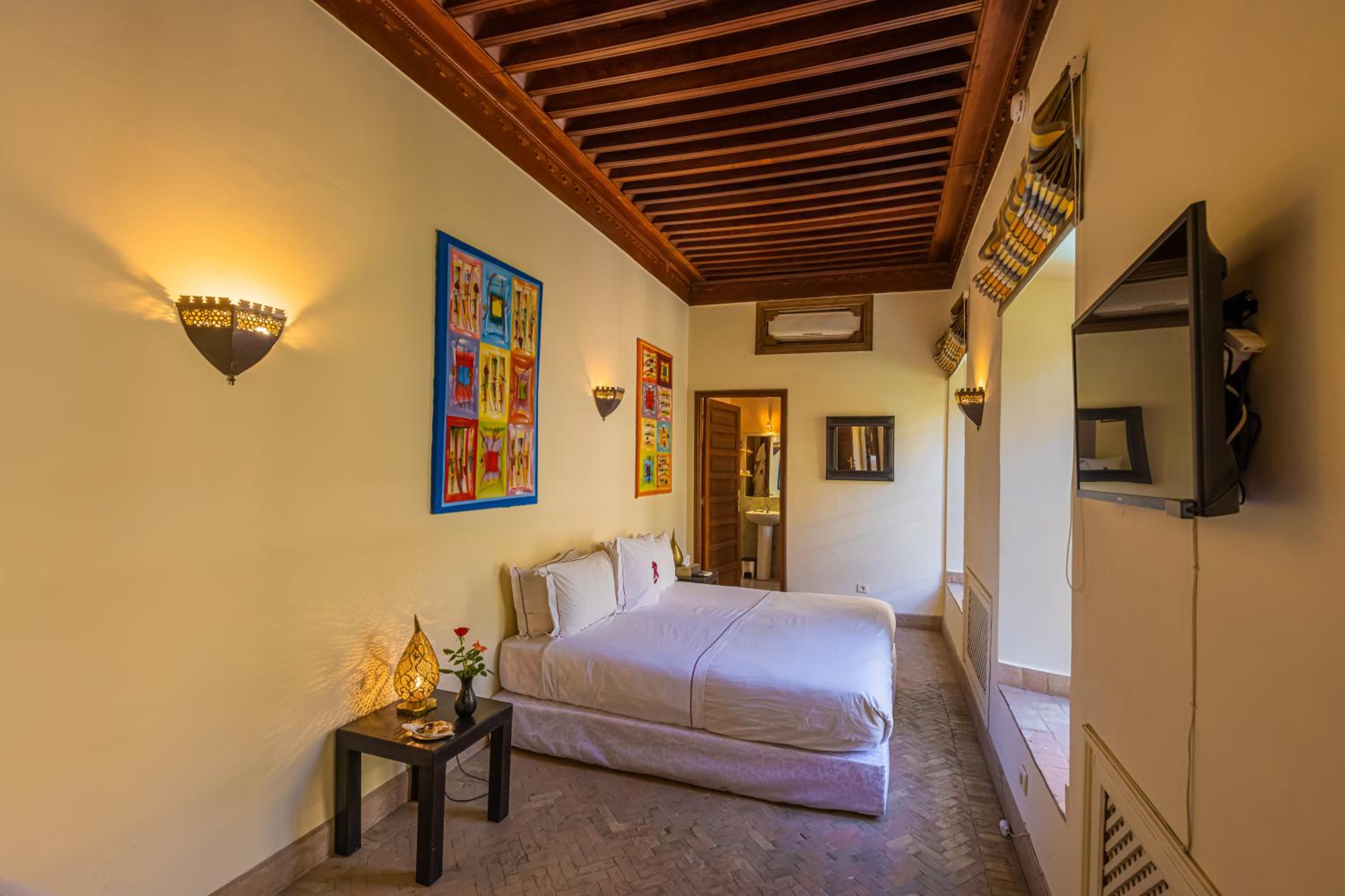 Riad Il Parco dei Principi, just 300 meters from Marrakech's center, offers a garden, bar, and restaurant. The air-conditioned units feature modern amenities like a flat-screen TV, terrace, and private bathroom, some with pool views. Enjoy the convenience of a 24-hour front desk, free WiFi, and security.