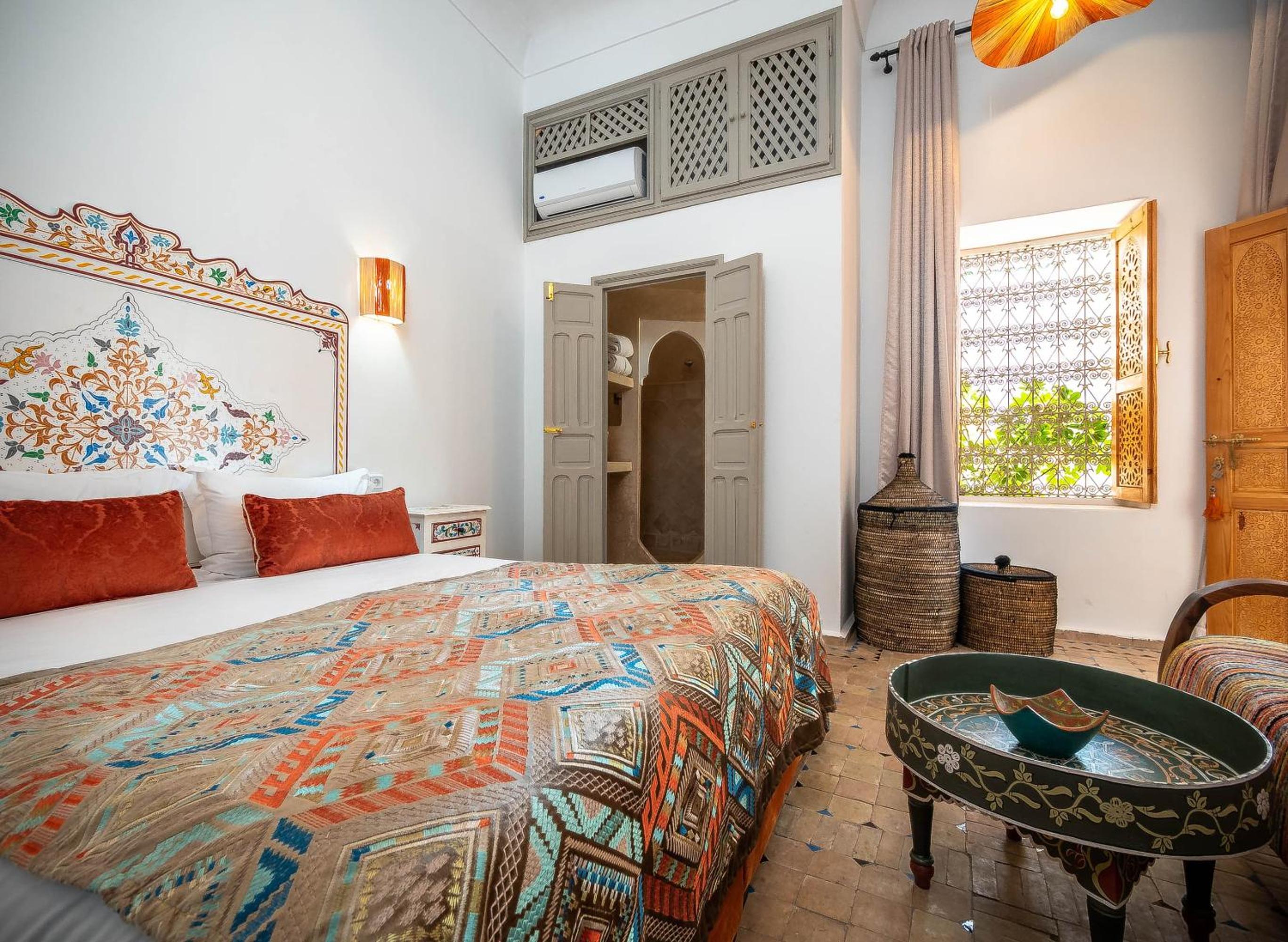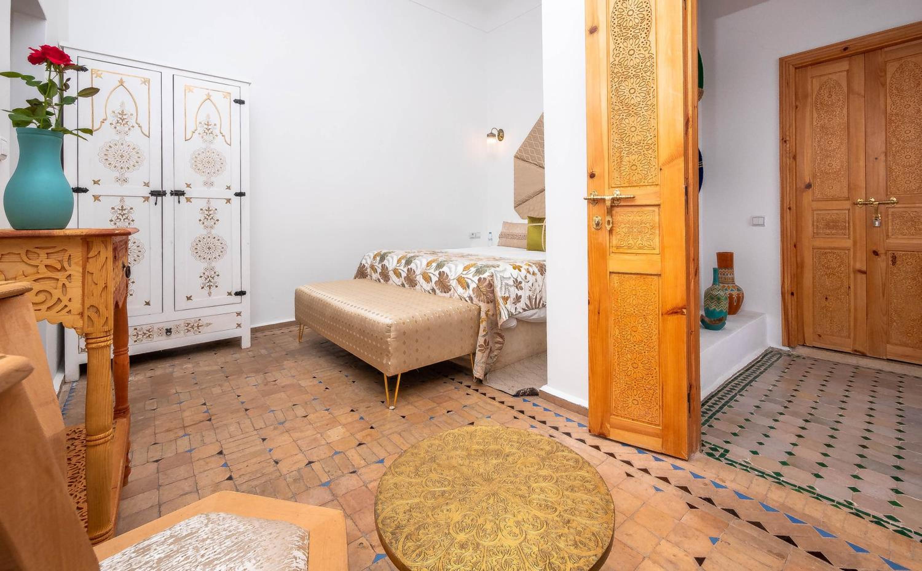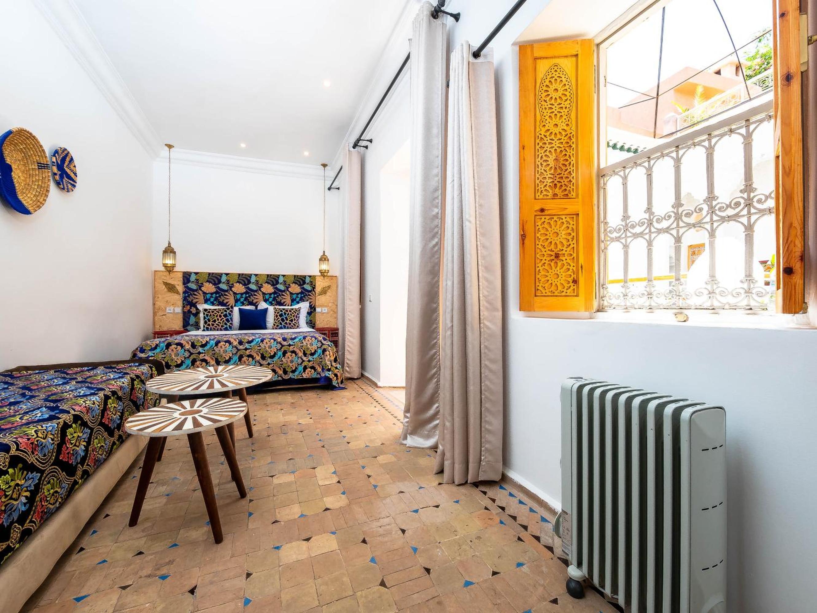 beau Riad, mais décevant vu la présentation faite par le site EXPEDIA. Nous avons réservé une chambre pour 3 personnes adultes dite DELUXE. Elle faisait moins de 15 m² ( hors salle de bain). Le 3ième couchage s'est résumé à un rajout d'un lit supplémentaire au bout du lit principal. Impossible de tourner autour du lit et d'ouvrir l'armoire. Chambre bruyante avec le ballon d'eau chaude ( électrique) qui se déclenchait plusieurs fois par nuit. Personnel très accueillant, très agréable, sympathique et toujours très prévenant.