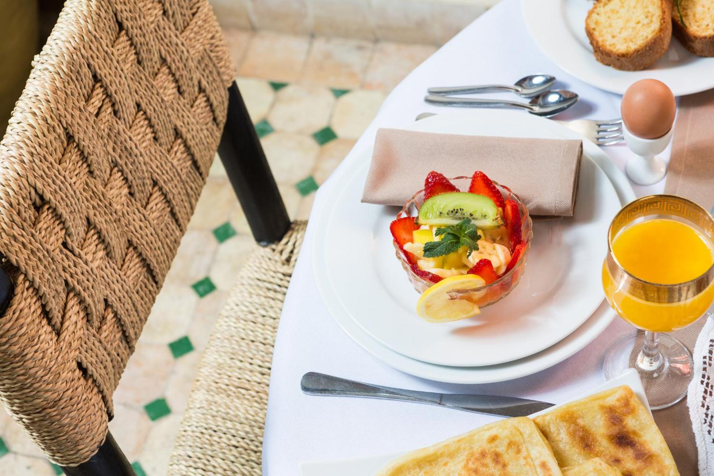 The Riad in question is beautiful and the staff and owners (Aladdin and Na3ima) are extremely charming and attentive to the hosts requests and needs, they have also offered tea and sweets without even asking for it. The bathrooms seems to have been recently renewed and the entire Riad and rooms are beautiful, and always clean. Breakfast cost us 50DH (around 5âŹ) each a day because we did not have it integrated in the reservation, but it was absolutely worth it, we rarely finished everything. Position is perfect for reaching the main plaza (Jame3 Lfna) by a small 7/10 minutes walk and from there, you can reach basically any attraction!