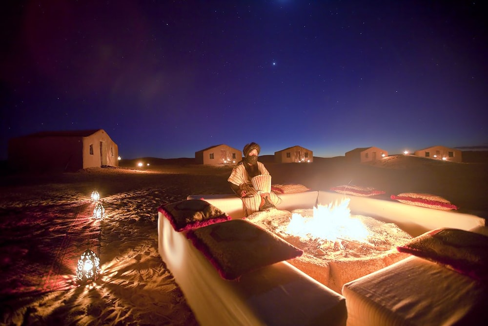 Empezar contando que nosotros los reservamos para el campamento de Zagora. El dueño del campamento me escribió por whatsapp comentandome que al final en el de Zagora no tenían hueco y me pasaron al de Tagounite (60 km mas abajo de Zagora). El campamento está una duna bastante grande, alejado de la carretera a 16 km de Tagounite. Está decorado bastante bien para estar en medio del desierto, tienen agua y electricidad. El baño estaba un poco sucio, pero nada importante, toral para pasar una noche no era inconveniente. Lo mejor sin duda poder ver el atardecer en medio del desierto, contemplar una noche mágica bajo las estrellas y ver una fantastico amanecer, Sin lugar a duda lo recomiendo. También comentar que en el campamento solo estábamos mi pareja, yo y el empleado Omar. Un chico fantástico que estuvo durante toda la estancia muy pendiente a nosotros. Se ganó una bonita propina.