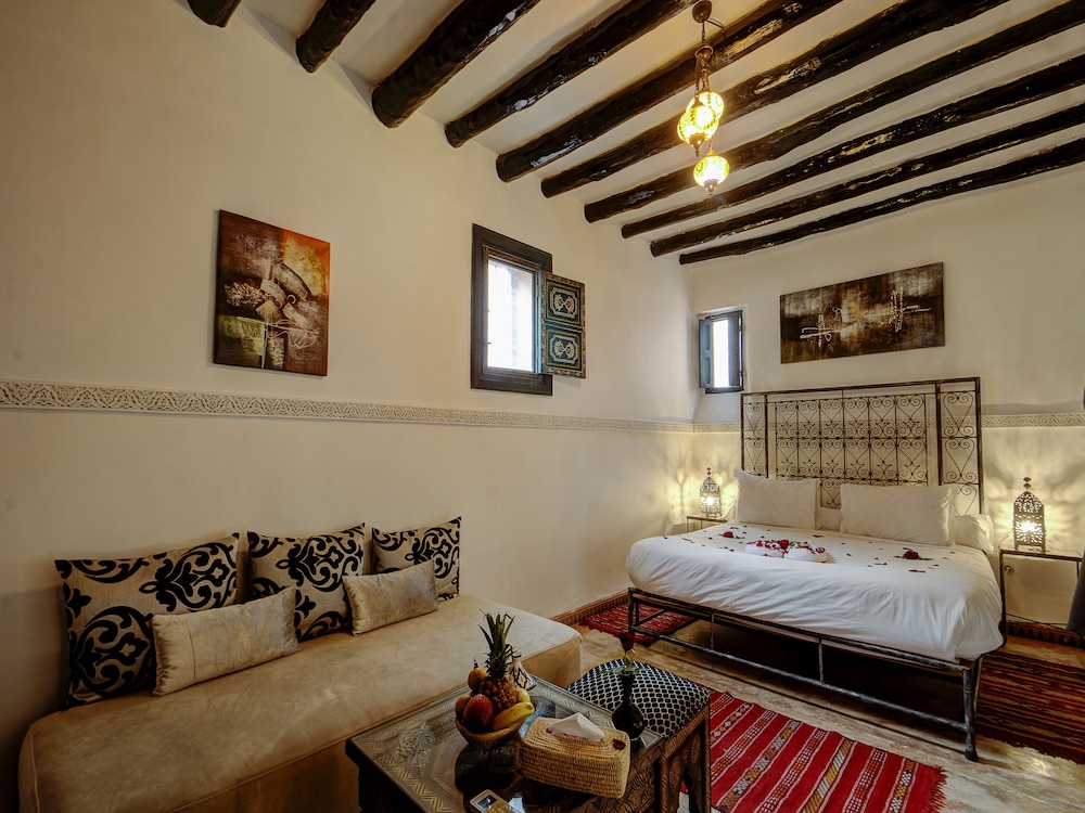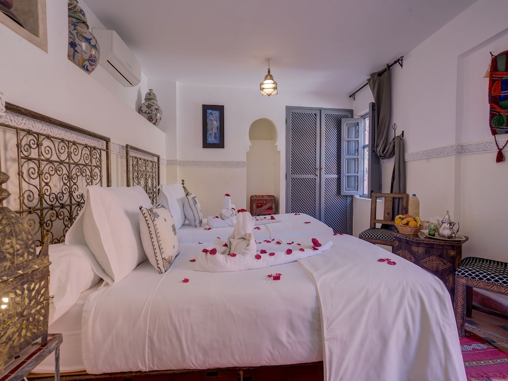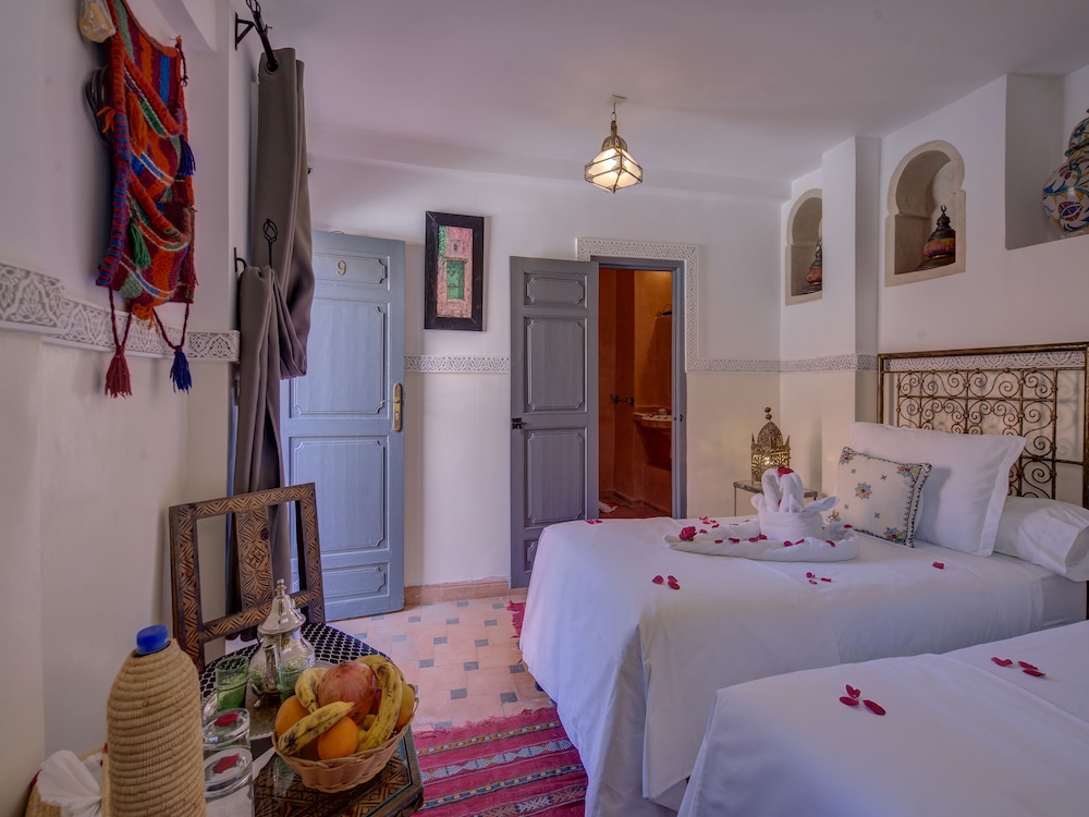 Tutto lo staff e' stato molto gentile, disponibile ed efficiente nella soluzioni di problemi, nel nostro caso la richiesta di cambiare la stanza che era inadeguata e non corrispondente a quanto prenotato in Booking.com Il Riad e' molto bello e curato, soprattutto il piano superiore con le sue terrazze, balconcini e piante e' molto scenografico. La posizione a pochi minuti a piedi dall'uscita nord della medina e' comoda se si vuole prendere un taxi. Abbiamo cenato la prima sera all'interno del Riad e il rapporto qualita' prezzo e' molto buono, tutto cucinato fresco al momento. Anche la colazione e' ottima e curata.