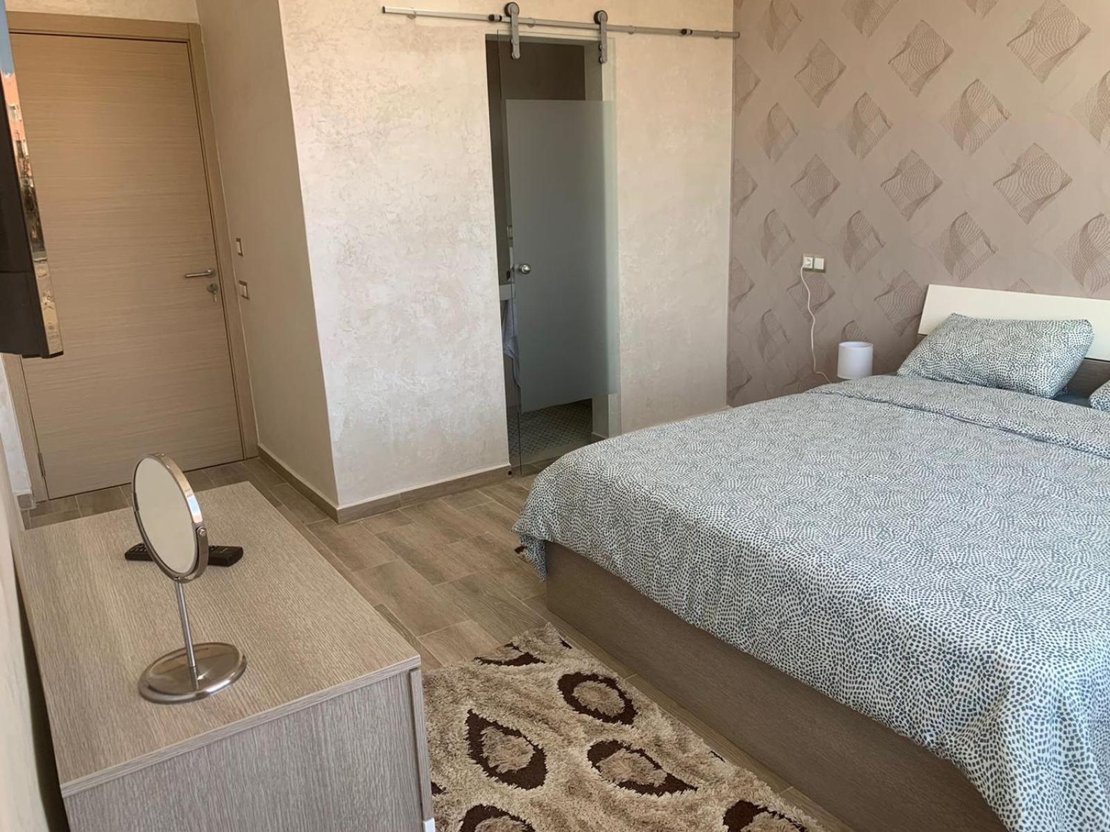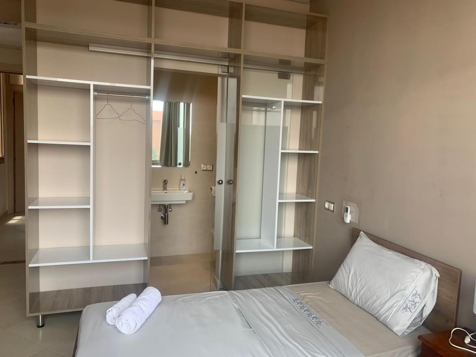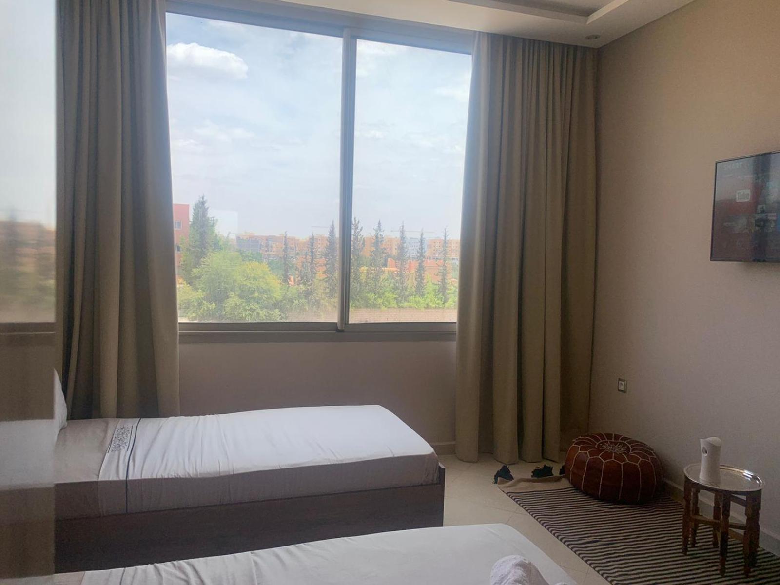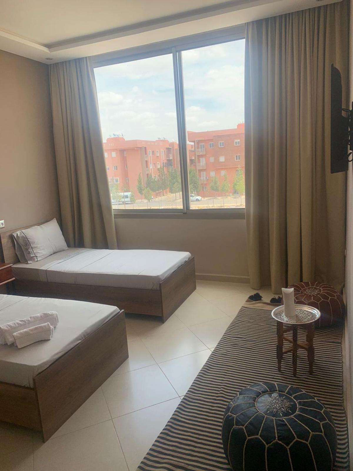 L'hôtel est effectivement à 2,7 km de l'aéroport, comptez 80 dirhams de taxi car l'emplacement est quand même considéré comme étant en centre-ville. C'est pratique pour être à l'aéroport dans les délais, mais beaucoup de taxis ont du mal à le trouver donc prévoyez de leur montrer l'itinéraire sur GPS. La jeune femme de la réception, très aimable, a fait de son mieux pour que nous puissions avoir un petit déjeuner (inclus dans le tarif Booking, mais seulement servi de 8h30 à 10h30) avec des msemen, du pain, du beurre, de la vache qui rit, des confitures, des olives et du thé à la menthe ; elle ne parle qu'anglais et arabe mais elle comprend le français. Le quartier n'a que des immeubles résidentiels (tous en construction) et peu de commerces, mais je recommande le snack Menna, situé juste en face en tournant le dos à la pharmacie, où nous avons dégusté un très bon thé à la menthe et de délicieuses brochettes, digne d'un resto plus chic; la propriétaire est très sympa et on peut discuter en français avec elle en plus.