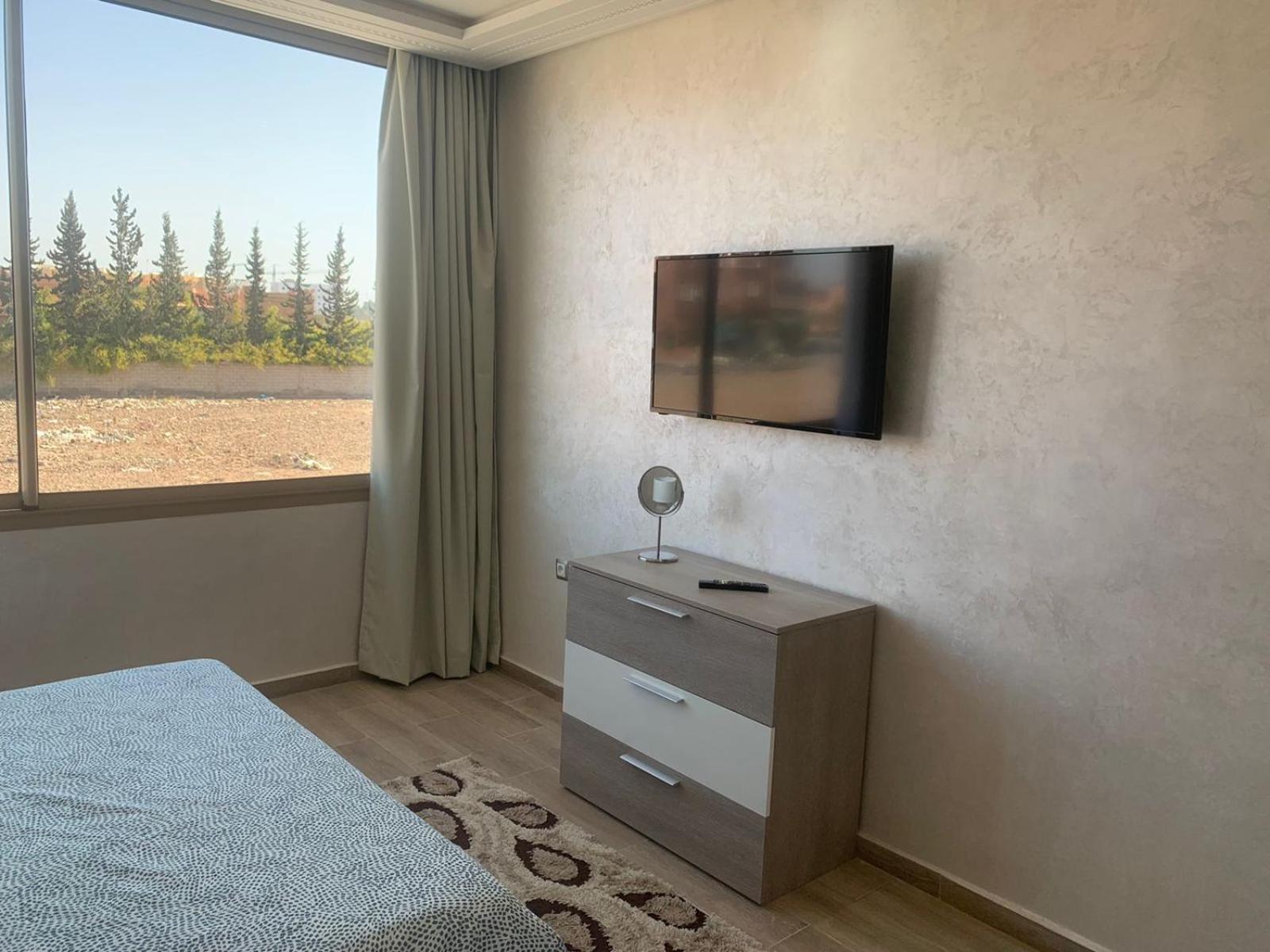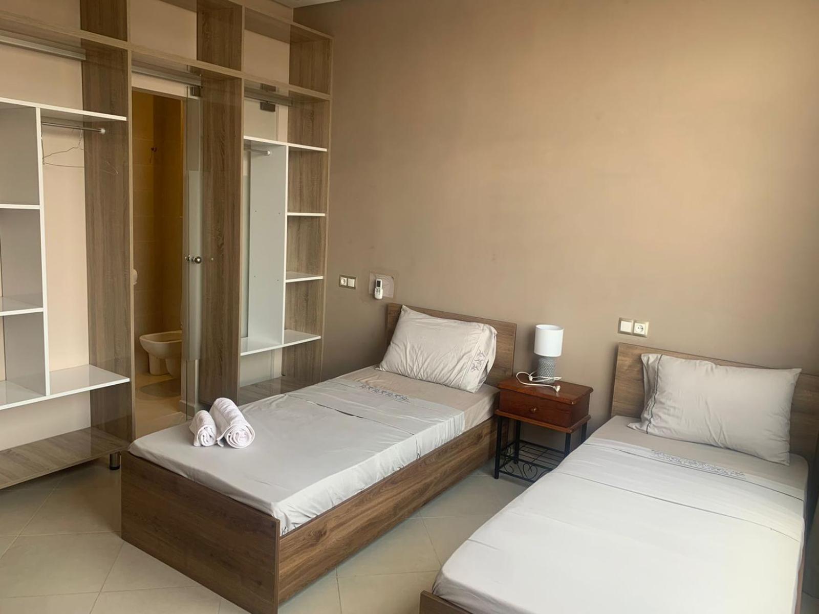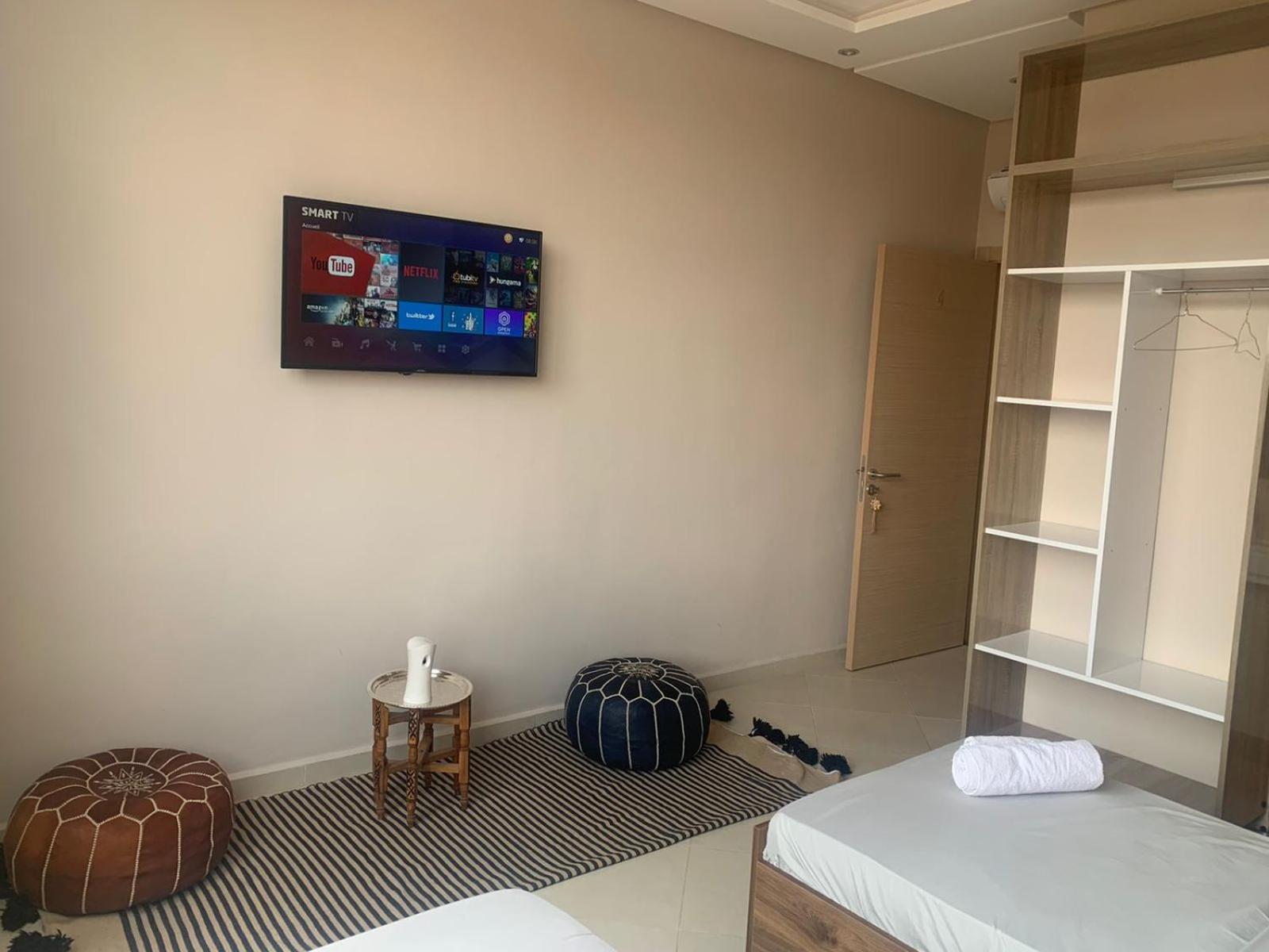 L'hôtel est effectivement à 2,7 km de l'aéroport, comptez 80 dirhams de taxi car l'emplacement est quand même considéré comme étant en centre-ville. C'est pratique pour être à l'aéroport dans les délais, mais beaucoup de taxis ont du mal à le trouver donc prévoyez de leur montrer l'itinéraire sur GPS. La jeune femme de la réception, très aimable, a fait de son mieux pour que nous puissions avoir un petit déjeuner (inclus dans le tarif Booking, mais seulement servi de 8h30 à 10h30) avec des msemen, du pain, du beurre, de la vache qui rit, des confitures, des olives et du thé à la menthe ; elle ne parle qu'anglais et arabe mais elle comprend le français. Le quartier n'a que des immeubles résidentiels (tous en construction) et peu de commerces, mais je recommande le snack Menna, situé juste en face en tournant le dos à la pharmacie, où nous avons dégusté un très bon thé à la menthe et de délicieuses brochettes, digne d'un resto plus chic; la propriétaire est très sympa et on peut discuter en français avec elle en plus.