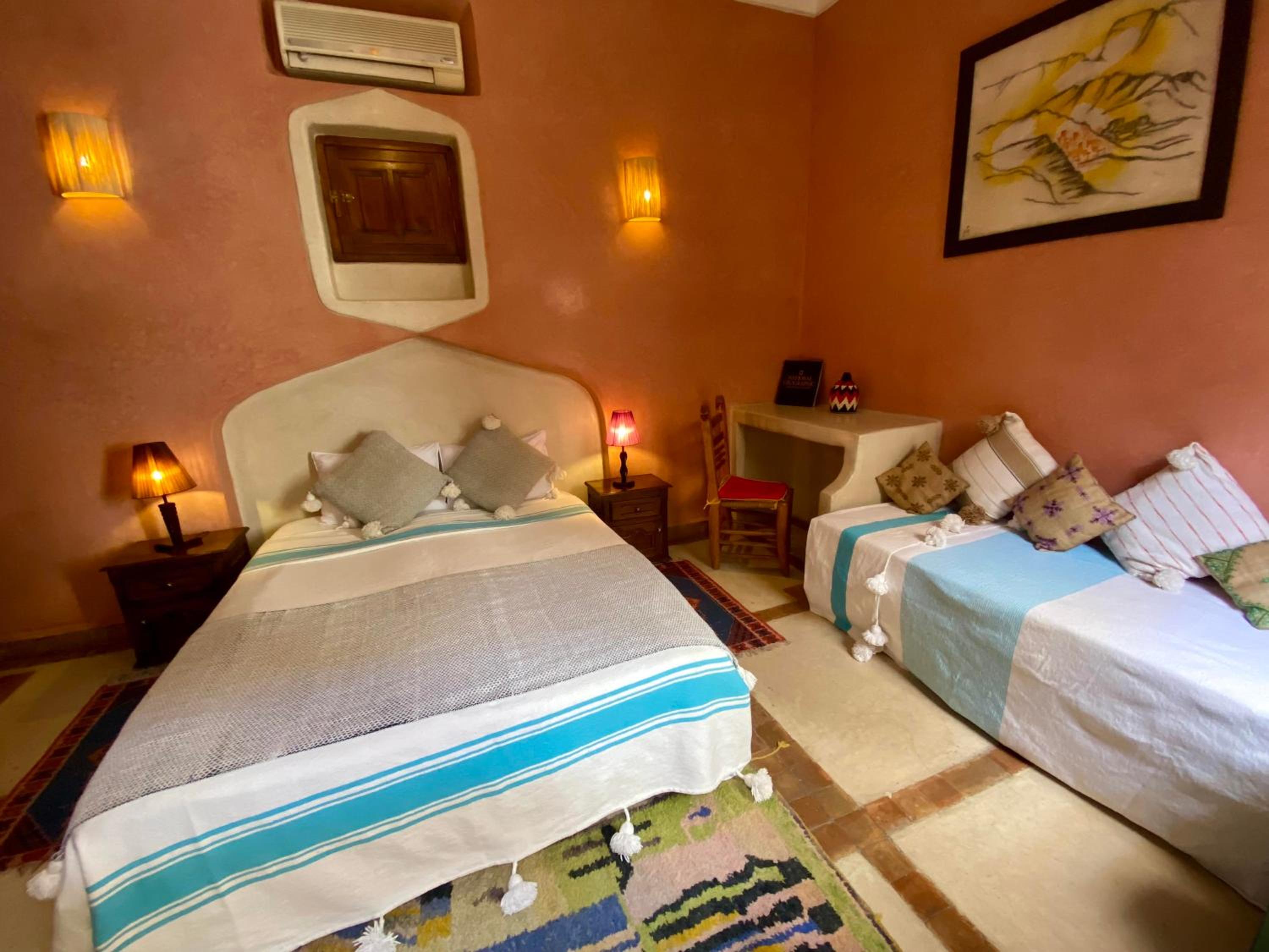 Luxurious Amenities: Guests at Riad Sabah can enjoy air-conditioned rooms with a private entrance, patio, and stunning views of the mountain and quiet street. The rooms are equipped with modern comforts like free WiFi, walk-in showers, and cozy seating areas.
