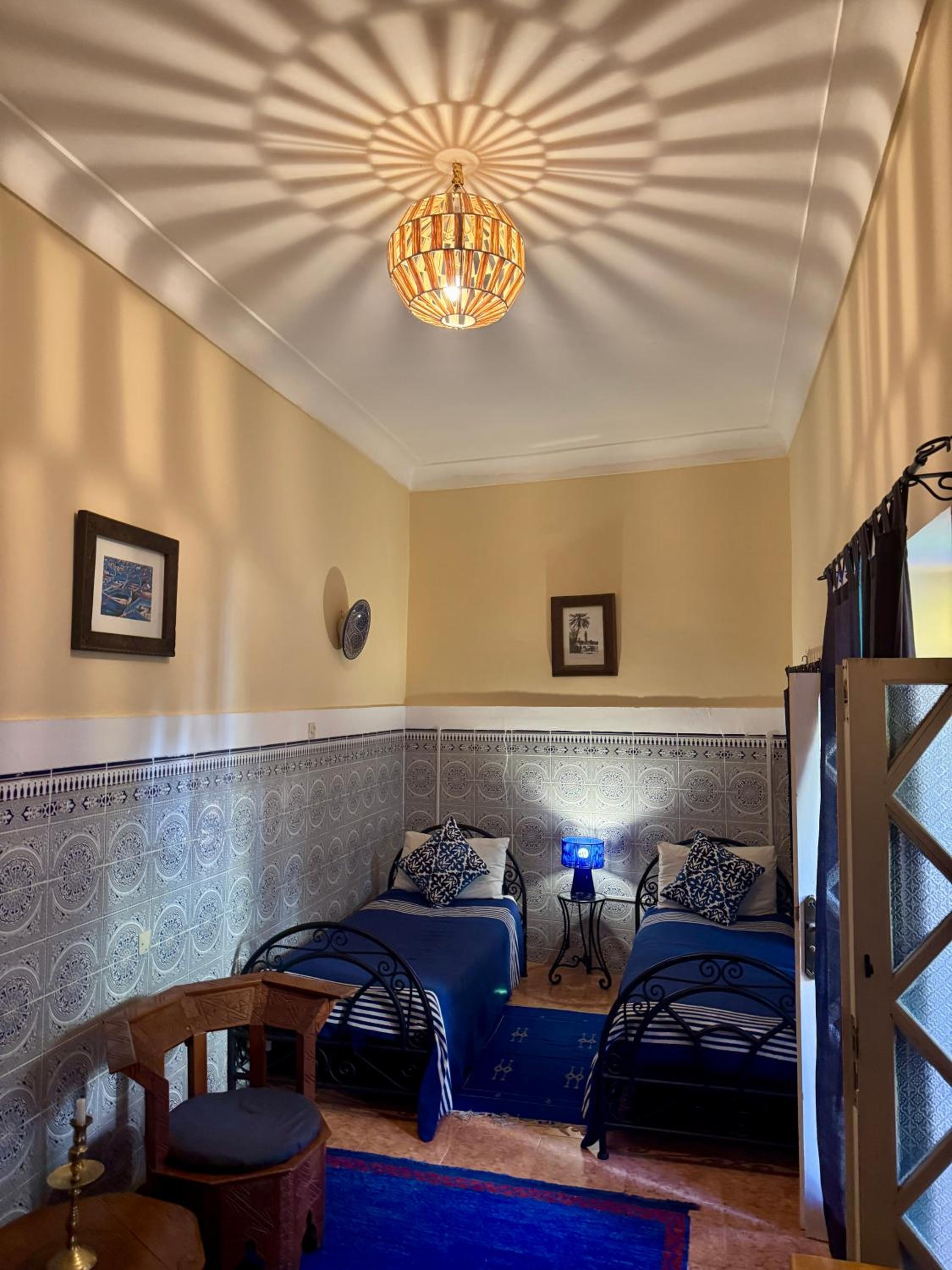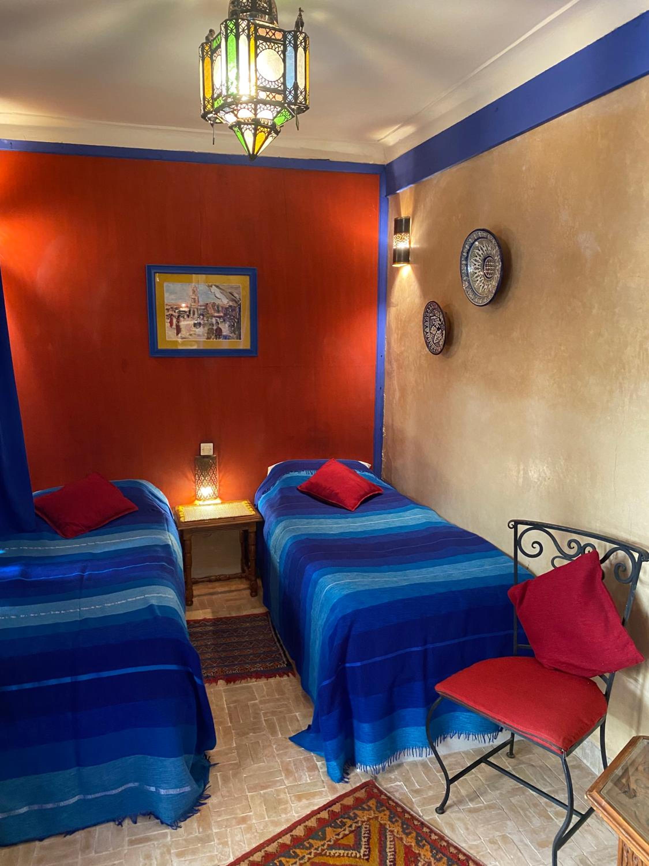 Das Zimmer war außergewöhnlich. Man schließt es mit zwei Türen. Alles sehr sauber. Personal sehr zuvorkommend. Einer an der Rezeption sprach sogar deutsch und war uns behilflich mit ausdrucken unserer Flugtickets, da Marrakesch keine online Tickets akzeptiert. Dachterrasse war schön. Frühstück war auch sehr gut. Kuchen und Aufstriche wurden immer abgewechselt jeden Tag. Man konnte auch nachbestellen wenn noch was wollte. Minztee und Kaffee zum selbst holen an der Theke drin zum Frühstück. Direkt in der Innenstadt, alles schnell zu erreichen wie der grosse Djemma el Fna Platz und Souks. Direkt beim Hotel in der Gasse sind Getränkemarkt und Ausflugsbüro.