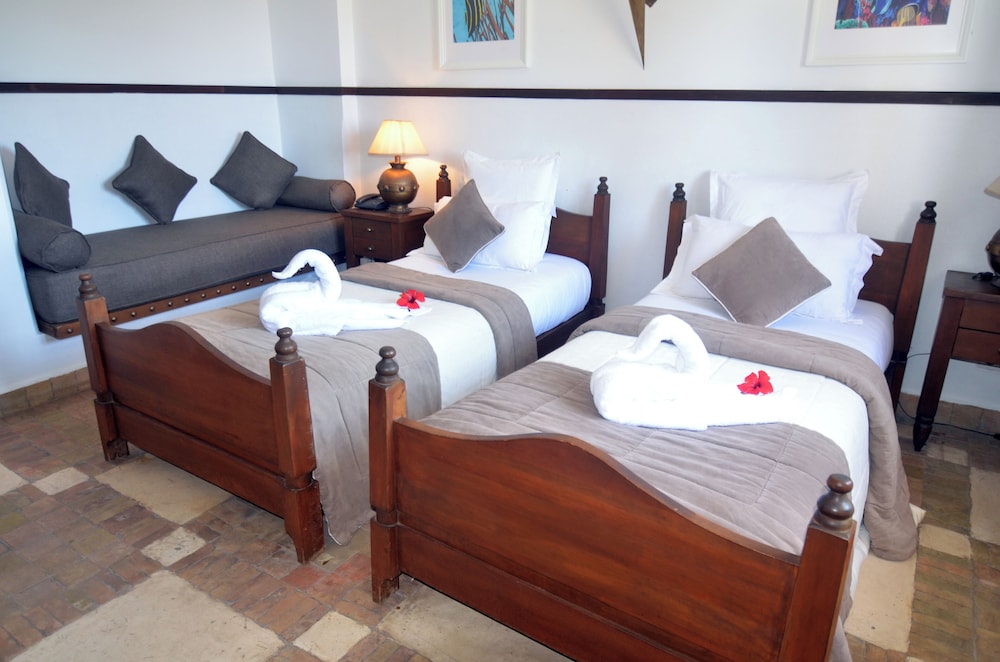 We had booked a suite with twin beds which was quite expensive for Morocco. When we got there hey did not have this available and tried to fob us off with a standard twin room and then a suite with a double bed - we are two friends so did not wish to share a bed. The rooms we were offered were grubby and smelled of damp - I could have cried -we had been so looking forward to this, and the cost was twice as much as we had paid for a beautiful Riad in Marrakesh. We checked out and went to a far better standard hotel 20 yards away for the same money