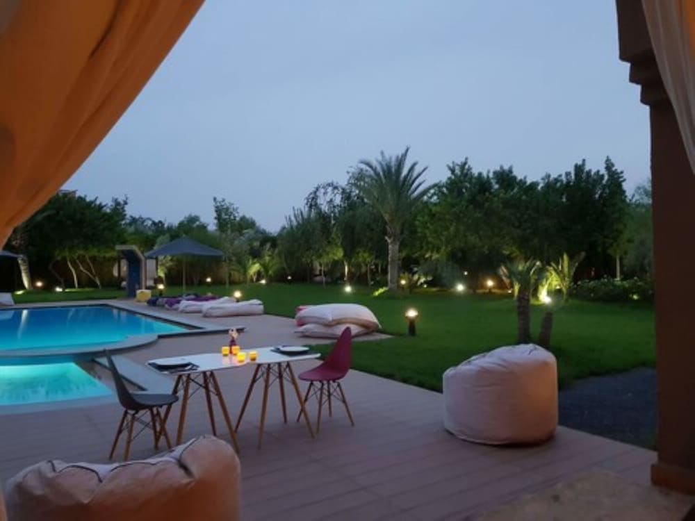 Nous avons passé quelques jours avec une amie La villa est tres belle nous avons eu une chambre a l'étage en face de la piscine Le petit déjeuner est correct et bon il y a aussi un service de restaurant aui est egalement tres bien Le seul bémol c'est que nous sommes a entre 15 et 20 minutes de la place jama Mais pas de panique il y a un service de taxi qui est irréprochable faut compter 20 euros aller retour Je recommande 🙌